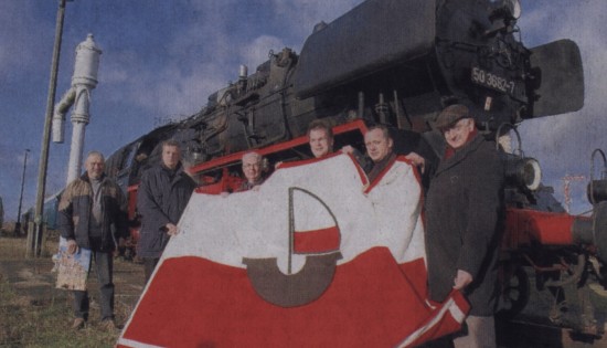 Manfred Preuß, Burkhard Bohn, Siegfried Schneider, Dennis Alexander Berg, Ulrich Damke und Michael Sommer (von links) mit der Hansefahne, die die Dampflokfreunde als Belobigung überreicht bekamen. |