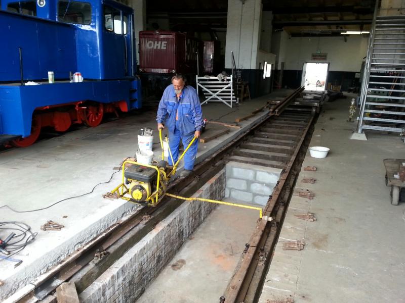 Nachdem wir festgestellt haben, dass der hölzerne Unterbau des Lokschuppengleises 16 langfristig nicht mehr tragfähig war, ist nun eine Erneuerung angesagt. Das Gleis und die Längsschwellen wurden entfernt und neues Material wird derzeit eingebaut, damit das Gleis zum Sommerfest am 4. und 5.7.2015 befahrbar wird und wir auch Platz für weitere Exponate haben.
